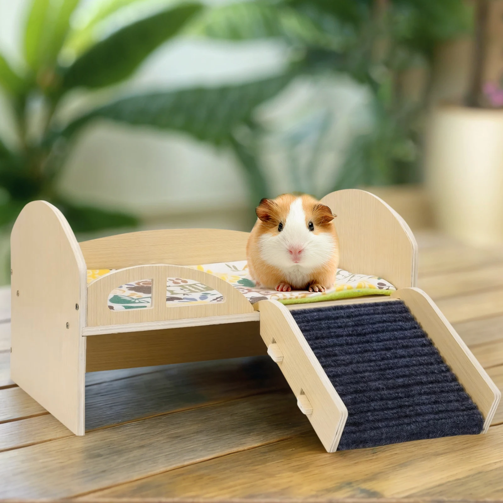 1.Elevated Design: Featuring an elevated structure, this wooden small animal bed offers guinea pigs ample hideout space when feeling scared, enhancing their sense of security. It provides a safe haven on the bed for your pet.